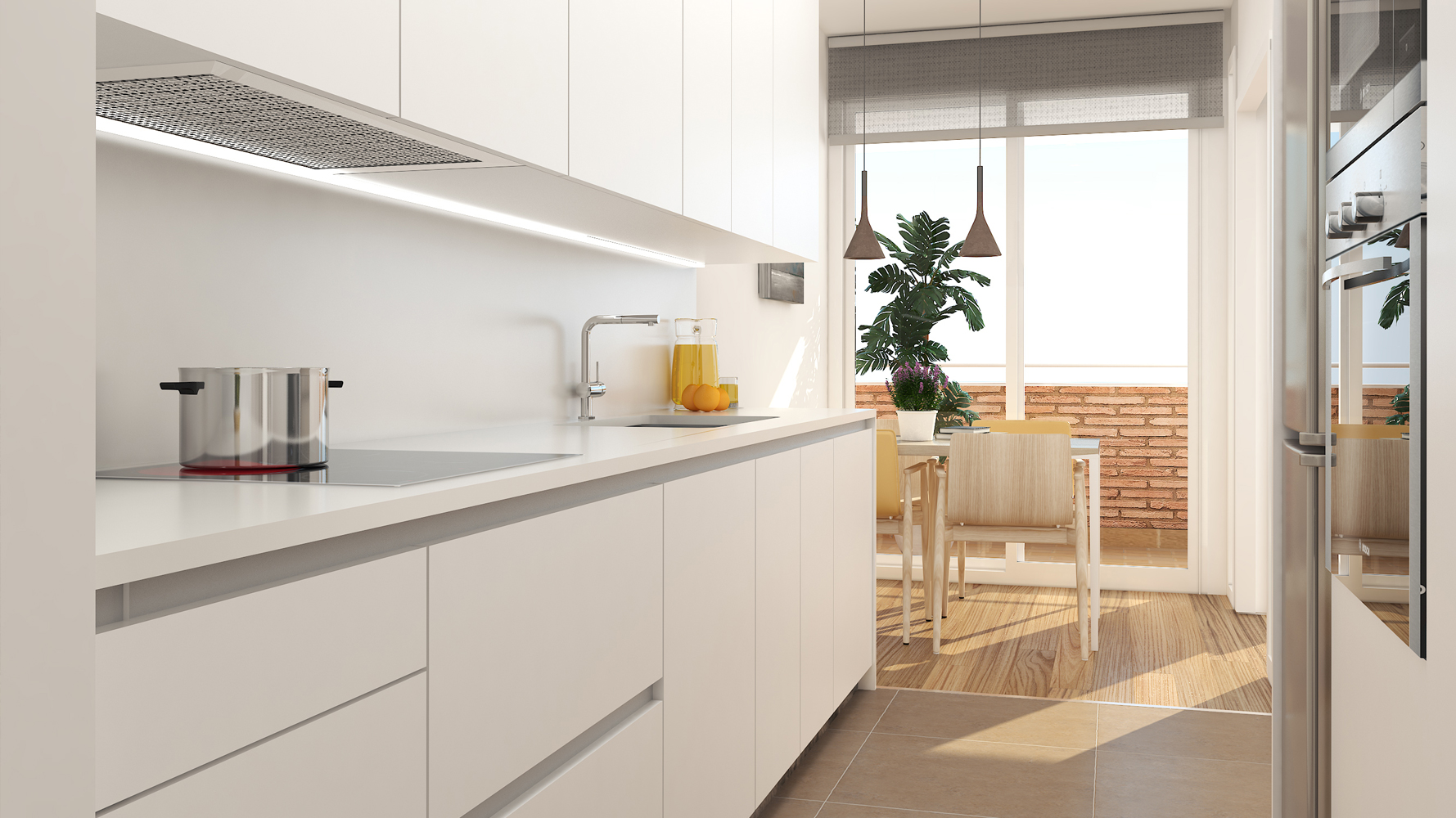 - Cuina equipada amb armaris de cuina marca DICA i electrodomèstics BOSCH o marca equivalent: placa de cuinar d’inducció, forn, microones i assecadora.