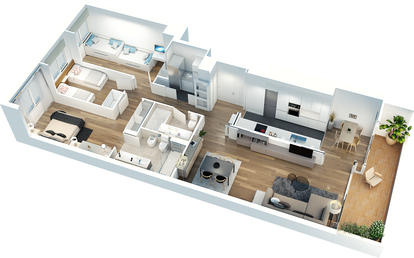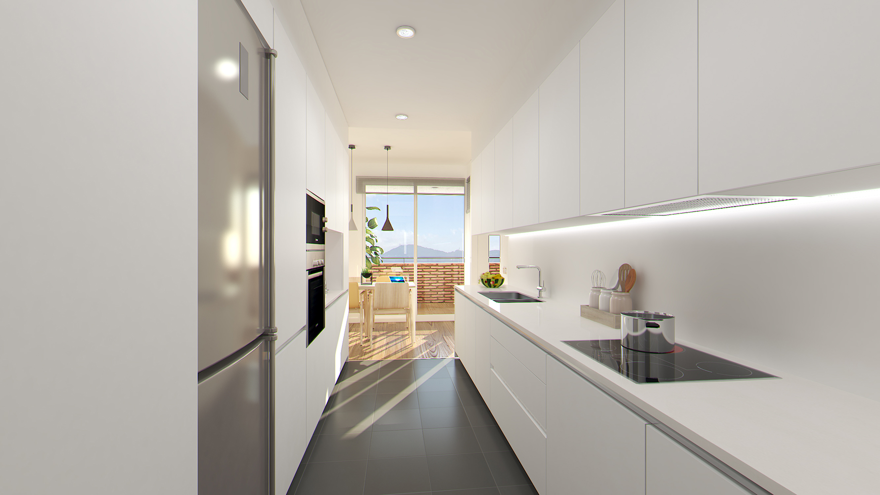 • Cuina equipada amb armaris de cuina marca DICA i electrodomèstics BOSCH o marca equivalent: placa de cuinar d’inducció, forn, microones i assecadora.